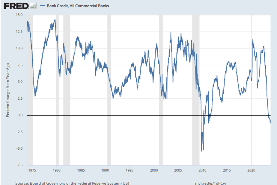 - Bank Credit: Demand for bank loans has been falling for well over a year now. This lack of demand has led to total bank credit contracting for only the third time in the past 50 years. The prior two times were during and immediately after the Great Financial Crisis.